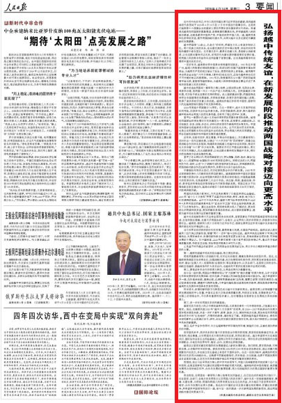럼 서기장은 이날 인민일보 3면에 3천700자 분량으로 '베트남·중국의 전통적 우호를 계승하고 새로운 발전 단계에서 양국 전략적 연계를 더 높은 수준으로 끌어올리자'라는 제목의 기고문을 게재했다.