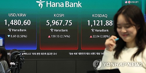 이날 코스피는 전장보다 159.13포인트(2.74%) 상승한 5,967.75에 거래를 마쳤다. 외국인은 8천620억원 남짓 순매수해 원/달러 환율 하락 압력을 더했다.
