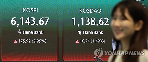이날 오전 10시 45분 현재 코스피는 전장보다 176.07포인트(2.95%) 상승한 6,143.82에 거래되고 있다.