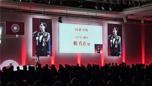 육상 자위대 중앙 음악대 소속 쓰구미 마이 3등육조(육군 하사관에 해당하는 계급)는 일본 국기 '히노마루' 등이 게양된 자민당 당대회 무대에 정복을 착용한 채 올라 기미가요를 불렀다.