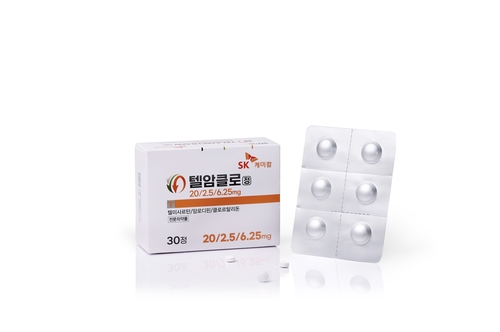 (서울=연합뉴스) 최현석 기자 = ▲ SK케미칼[285130]은 저용량 3제 복합 고혈압 치료제 '텔암클로정'을 출시했다고 16일 밝혔다. 텔암클로는 텔미사르탄 20㎎, 암로디핀 2.5㎎, 클로르탈리돈 6.25㎎을 결합한 저용량 복합제로, 각 성분을 단일제 표준용량 대비 절반 수준으로 구성했다. 주성분인 텔미사르탄은 혈관 수축을 억제하는 역할을 하고, 암로디핀은 혈관을 이완시키는 작용을 한다. 클로르탈리돈은 체내 나트륨과 수분 배출을 통해 혈압을 조절하는 기전을 지녀 다양한 원인에 복합적으로 작용해 효과적인 혈압 조절이 가능하다는 것이 회사 측 설명이다. 국내 28개 기관에서 300여 명의 환자를 대상으로 진행된 임상시험에서 텔암클로 투여군 환자의 8주 시점 수축기 혈압은 기저 대비 평균 19.43mmHg 감소해 텔미사르탄 40㎎ 단일제(15.65mmHg 감소) 대비 더 큰 혈압 강하 효과를 보였다. 혈압 조절률 역시 약 70%로 단일제 대비 높은 수준을 나타냈다.