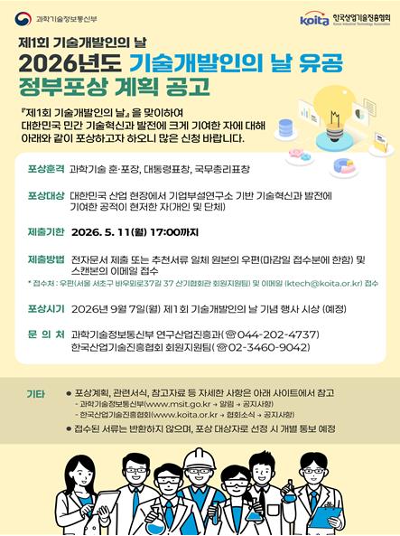 공모 접수는 내달 11일까지며 자세한 사항은 과기정통부와 한국산업기술진흥협회 홈페이지에서 보면 된다.