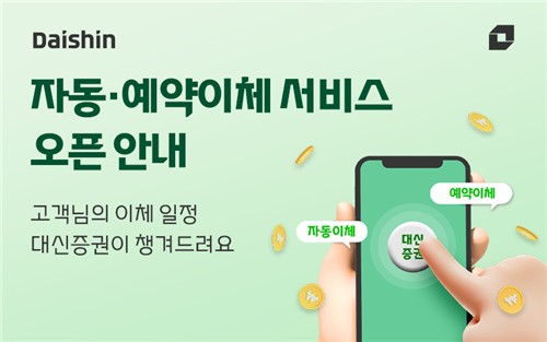 (서울=연합뉴스) 고은지 기자 = 대신증권[003540]은 고객이 지정한 날짜에 일정 금액을 자동으로 보내거나 받을 수 있는 '계좌 자동·예약이체 서비스'를 모바일트레이딩시스템(MTS) 뱅킹 모드에 도입했다고 17일 밝혔다.