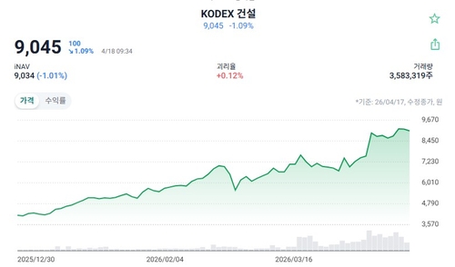 KODEX 건설 ETF 주가가 지난해 말 4천115원에서 9천45원으로 급등하며 119.8%의 수익률을 기록했고, TIGER 200 건설 ETF도 4천625원에서 9천810원으로 112.1% 상승했다.