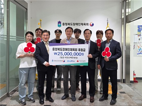 ▲ 에코프로는 지난 17일 제46회 장애인의 날을 맞아 사업장이 위치한 청주에서 장애인 선수들의 훈련 환경 개선과 사기 진작을 위해 충북장애인체육회에 기부금 2천500만원을 전달했다고 19일 밝혔다. 이와 함께 에코프로 산하 장애인 스포츠단인 온누리스포츠단의 훈련장을 방문해 선수들에게 응원 간식을 전달하며 격려했다. 같은 날 직원들은 포항시북부장애인종합복지관이 주관한 '북부에서, 함께라면' 행사에 참여해 특식 배식 봉사와 나눔 활동도 진행했다. (서울=연합뉴스)