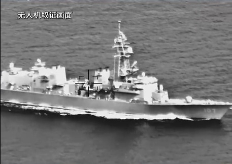 영상에는 함번호 107인 일본 해상자위대 구축함 '이카즈치'가 포착됐으며, 대함미사일 탑재 모습도 확인된다고 중국 측은 주장했다.