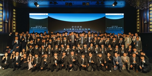 ▲ 주한독일상공회의소는 지난 17일 반얀트리 클럽 앤 스파 서울에서 '2026 아우스빌둥(Ausbildung) 졸업식'을 개최하고 총 65명의 수료생을 배출했다고 20일 밝혔다. 아우스빌둥은 독일의 이원화 직업교육 제도로, 기업 현장 중심 실무 교육(70%)과 대학 이론 교육(30%)을 병행하는 36개월 과정이다. 수료생은 전문학사 학위와 함께 독일연방상공회의소(DIHK) 인증서를 취득하며, 일부 기업에서는 자체 레벨 인증도 부여한다. 주한독일상의가 2017년 프로그램을 국내 도입했고, 현재 메르세데스-벤츠 코리아, BMW 그룹 코리아, 포르쉐코리아 등 국내 진출 독일 완성차 업체가 모두 참여하고 있다. (서울=연합뉴스)