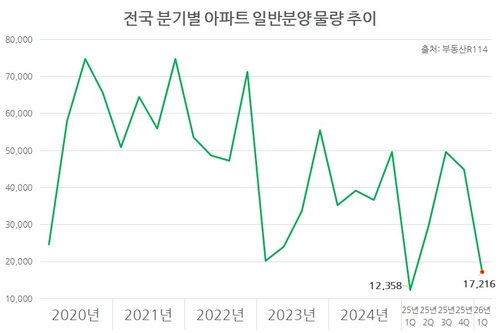 20일 부동산R114 자료에 따르면 올 1분기 전국 아파트 일반분양 물량은 1만7천216가구로 직전 분기 대비 61.5% 감소했다.