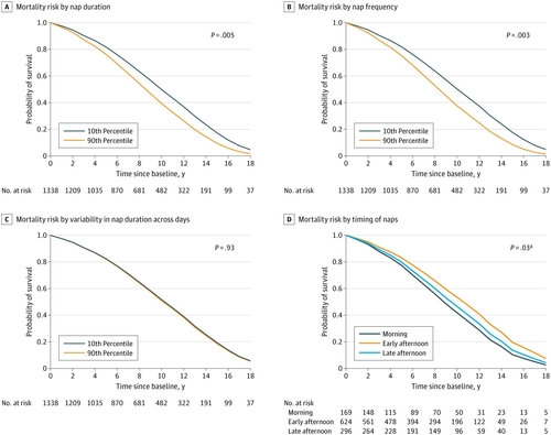 낮잠을 오전에 자는 사람은 오후에 자는 사람보다 사망 위험이 약 30% 높았고, 낮잠 시간이 하루 1시간 늘어날 때마다 사망 위험이 약 13% 증가했으며, 하루 낮잠 횟수가 1회 늘어날 때마다 사망 위험이 약 7% 높아졌다.