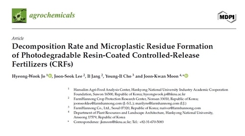 (서울=연합뉴스) 강태우 기자 = LG화학[051910]의 자회사인 팜한농은 '광분해 코팅 완효성 비료 기술' 관련 논문이 국제 학술지 아그로케미컬스에 게재됐다고 21일 밝혔다.