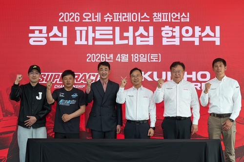 (서울=연합뉴스) 임성호 기자 = 금호타이어는 국내 최고 권위의 모터스포츠 대회인 '2026 오네(O-NE) 슈퍼레이스 챔피언십' 토요타 가주 레이싱 6000 클래스 참가팀 후원 조인식을 맺었다고 21일 밝혔다.