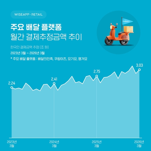 배달 플랫폼 4사의 합산 결제 추정 금액은 2023년 3월 2조2천400억원, 2024년 3월 2조4천100억원, 2025년 3월 2조7천500억원으로 매년 증가세를 이어왔다.