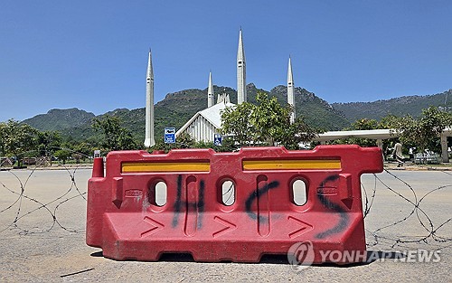 (이슬라마바드=연합뉴스) 손현규 특파원 = 지난 20일 오후(현지시간) 파키스탄 수도 이슬라마바드에 있는 이슬람 사원인 '파이살 모스크' 진입로에는 평소 볼 수 없었던 철조망이 쳐져 있었다.