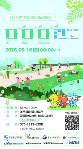 (서울=연합뉴스) 조승한 기자 = ▲ 국립중앙과학관은 내달 16일 연구단지 생물다양성 마라톤 '다다다런'을 개최한다고 21일 밝혔다. 이번 행사는 시민들이 자연 속에서 걷고 달리며 생물다양성의 의미를 이해할 수 있도록 마련됐다. 대전 갑천 근방 산책로 일원에서 5㎞, 10㎞ 코스를 운영하며 열리며 800명 규모로 운영된다. 중앙과학관은 이번 행사를 대전 지역 특색을 살린 공공 과학문화 행사로 발전시키겠다고 밝혔다.