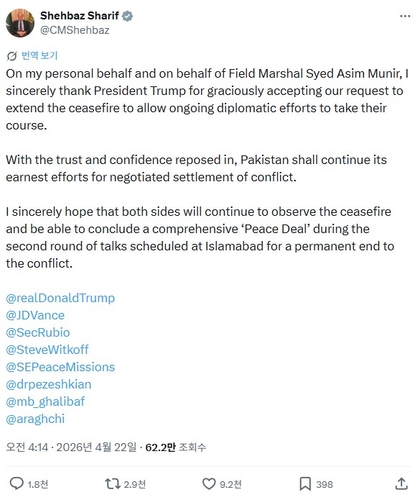셰바즈 샤리프 파키스탄 총리는 22일(현지시간) 엑스(X·옛 트위터)에서 "개인적으로 그리고 아심 무니르 총사령관을 대신해서, 나는 진행 중인 외교적 노력이 결실을 볼 수 있도록 우리의 휴전 연장 요청을 흔쾌히 수락한 트럼프 대통령에게 진심으로 감사드린다"고 밝혔다.