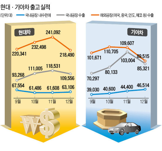 전문가들은 자동차 업종에 대한 시장의 부정적 기류를 바꿀 계기가 없는 만큼 당분간은 조정세가 이어질 가능성이 높은 것으로 내다보고 있다. 일단 현대·기아차의 수출 실적 부진이 개선될 필요가 있다는 지적이다. 국내 완성차 업계의 지난해 12월 수출은 전년 같은 기간에 비해 9.7%, 11월에 비해선 9.1% 줄었다. 크리스마스 등으로 영업일수가 줄고 생산 물량 자체가 적었기 때문이라지만 현대·기아차의 4분기 실적이 최근 몇 년간의 성장 추세에서 이탈하는 것 아니냐는 우려도 제기되고 있다.