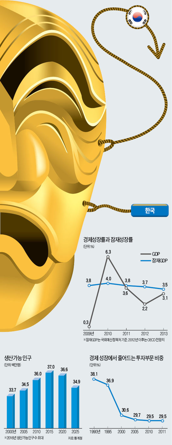 한국의 잠재성장률도 큰 폭으로 떨어지고 있다. 한국은행과 국회예산처에 따르면 잠재성장률은 1990년대 6.1%에서 2001~2004년엔 4.8%로 낮아졌다. 이후에도 꾸준히 하락해 현재 3.7%로 주저앉았다. 한국 경제도 잠재성장률에 크게 못 미치는 부진이 2011년 이후 2년째 이어지고 있다. 최근 분위기는 더욱 심상찮다. 지난해 3분기 GDP 증가율은 전기 대비 0.1%로, 3년6개월 만에 최저를 기록했다. 설비투자는 2분기 연속 감소했다. 이우광 한일산업기술협력재단 자문위원은 “국내 여건을 볼 때 한국도 장기불황의 초입에 들어섰다”며 “잠재성장률을 3% 후반에서 유지할 수 있을지 따져보면 상당히 절망적”이라고 말했다.