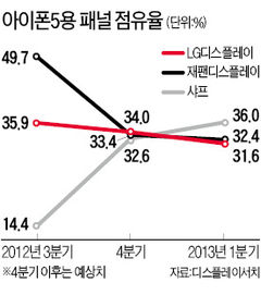 아이폰5용 패널은 터치스크린과 패널을 합친 인셀(in-cell) 방식의 부품으로 전 세계에서 재팬디스플레이와 샤프, LG디스플레이만 애플에 납품하고 있다. 작년 3분기에는 재팬디스플레이가 49.7%의 점유율로 1위였다가 4분기부터는 3개 업체가 비슷한 물량을 애플에 공급하고 있는 것으로 추정된다.