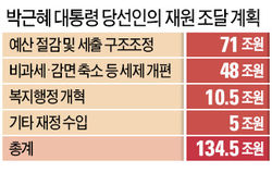 박근혜 대통령 당선인은 지난해 11월18일 대선 후보로는 처음 나라살림 가계부를 공개했다. 집권 5년간 정부 씀씀이를 줄여 71조원(연 14조2000억원)을, 각종 세금 감면을 줄여 48조원(연 9조6000억원)을 마련하겠다는 것이 골자다. 당선인 측은 “공약의 재원 조달 계획을 일목요연하고 치밀하게 짜 공개한 것은 대선 사상 처음”이라며 “약속한 재원과 지출이 일치하도록 철저하게 검증할 것”이라고 공언했다. 하지만 대선 뒤 상황은 다르게 돌아갔다. 각 부처의 대통령직 인수위원회 업무보고에서 박 당선인의 복지 공약 등에 필요한 재원이 당초 추계보다 더 들어갈 것이라는 전망이 잇따라 나왔다. 인수위는 결국 지난 13일 예산당국인 기획재정부에 종합적인 재원 조달 대책을 마련, 이달 중 보고하라는 지시를 내렸다. 당선인이 제시한 재원 총량(134조5000억원)만 던져 놓고 이를 맞출 세부 방안을 요구한 것이다.