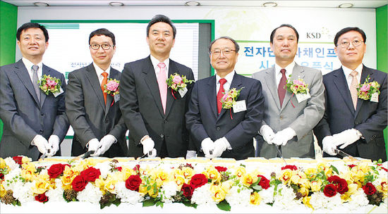 예탁결제원은 15일 서울 여의도 본사에서 전자단기사채 시스템 오픈식을 개최했다. 행사에는 김신 현대증권 사장(왼쪽부터), 김학수 금융위원회 자본시장과장, 유재훈 증권선물위원회 상임위원, 김경동 한국예탁결제원 사장, 황성호 우리투자증권 사장, 나재철 대신증권 대표 등이 참석했다.