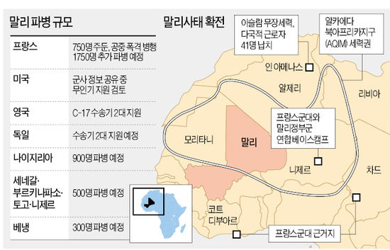한때 수도까지 점령당할 뻔했던 말리 정부군은 10일 프랑스에 지원을 요청했다. 말리의 이슬람 반군은 1300명 수준으로 알려졌다. 푸랑수아 올랑드 프랑스 대통령이 “테러분자 소탕과 말리의 자국민 6000명을 보호하기 위한 것”이라고 개입을 시작하며 위기를 넘겼다.