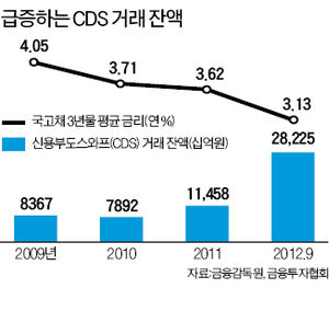 한 증권사 신용파생상품 담당 연구원은 “작년 유럽 재정위기로 국내 채권금리는 하락하고 글로벌 CDS 프리미엄은 급등하면서 두 자산을 결합한 신용파생상품 거래가 급격히 늘었다”고 말했다.