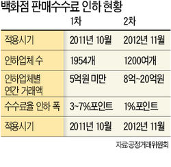 박근혜 대통령 당선인의 최근 대통령직 인수위원회 경제1분과 토론회 발언을 계기로 백화점 입점업체 수수료와 판촉비 문제가 다시 수면 위로 떠올랐다. 28일 업계와 공정거래위원회에 따르면 롯데 현대 신세계 등 백화점 ‘빅3’는 2011년 10월 입점업체 중 1954개 중소 업체에 적용하는 수수료율을 3~7%포인트 인하했다. 지난해 11월에도 2011년 인하 때 혜택을 받지 못했던 1200여개 업체를 대상으로 수수료율을 1%포인트 낮췄다.