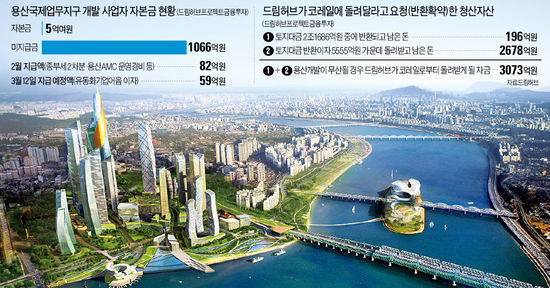 민간 출자사들이 청산자산 카드를 꺼내든 것은 ‘파산’으로 사업 자체가 공중 분해되는 것은 막아야 한다는 공감대가 형성됐기 때문이다. 2007년 자본금 1조원으로 출범한 드림허브는 부동산시장 침체와 주주 간 이견 등으로 추가 자금 확보에 실패하면서 남은 자금이 5억여원에 불과할 정로도 재정난을 겪어왔다.