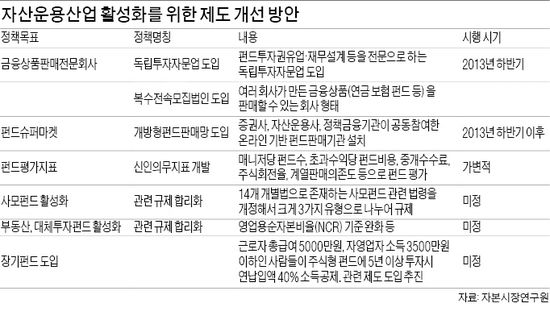 개방형 펀드 판매망인 ‘펀드 슈퍼마켓’도 도입한다. 슈퍼마켓은 대부분 운용사들이 내놓은 펀드를 판매하는 역할을 한다. 상품이 다양화되는 데다 온라인 판매를 하므로 가입 비용도 낮아진다. 금융위는 자산운용사 증권사 정책금융기관 펀드정보사업 등이 지분을 공동 출자해 지배주주 출현을 억제하기로 했다.