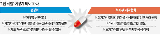 공정위는 이에 대해 “개별 사업자가 자유롭게 결정해야 할 의약품 공급 여부와 공급가격 결정 행위에 사업자단체가 관여하는 것은 경쟁을 제한하는 행위”라고 지적했다. 조사 과정에서 제약협회가 “1원 낙찰은 불합리한 관행”이라고 소명했지만 받아들이지 않았다. 박재규 공정위 서울사무소 총괄과장은 “최저가 입찰은 현행법상 위법이 아니다”며 “제도 개선 필요성이 법 위반 사유가 돼선 안 된다”고 못박았다.