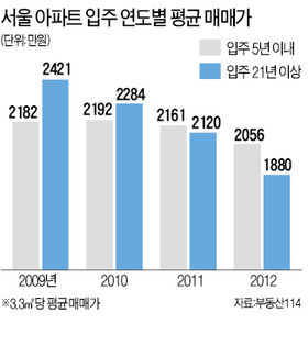 김은진 부동산114 연구원은 “2010년까지는 입주 20년이 넘은 아파트 가격이 강세였지만 2011년부터 새 아파트 가격이 더 비싸지는 현상이 나타났다”며 “재건축을 해봐야 차익을 남길 수 없는 상황이 되면서 거주 여건이 좋은 새 아파트를 선호하는 현상이 뚜렷해지고 있다”고 설명했다.