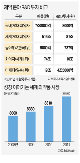 ▷사회=국내 제약업체들의 신약 개발 경쟁력은 어떤 수준인가.▷오태광 원장=국내 상장 제약사의 R&D 투자비율은 9.1%로 글로벌 제약사(16.8%)의 절반 수준이다. 비아그라로 유명한 미국의 화이자에 비해 국내 1위 기업인 동아제약의 R&D 투자액은 135분의 1에 불과하다. 연구인력 문제도 심각하다. 박사급 전문인력은 미국의 100분의 1 수준, 일본과 비교해도 5분의 1 수준에 불과하다.