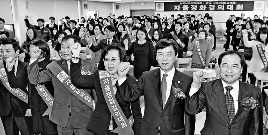 한국학원총연합회 산하 외국어교육협의회 강남·서초지회(강외협)는 6일 서울 삼성동 강남교육지원청에서 ‘자율정화결의대회’를 열어 탈법·편법 행위를 뿌리 뽑고 양질의 학원교육 서비스를 제공하기로 결의했다. 행사에는 청담어학원 등 강남·서초구 98개 어학원 관계자 150여명이 참석했다.
