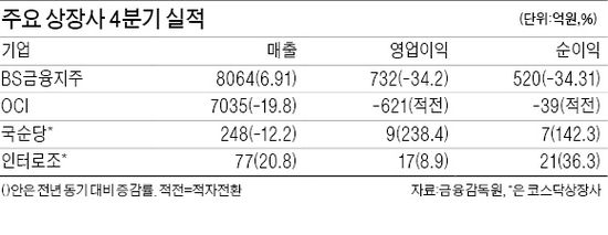 부산은행을 자회사로 둔 BS금융지주는 작년 4분기에 순이익 520억원을 기록했다. 전년 동기 대비 34.31% 감소한 것이다. BS금융지주의 작년 한 해 순이익은 전년 대비 9.78% 줄어든 3611억원으로 집계됐다.