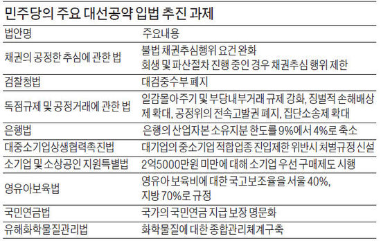 정무위원회에 계류 중인 법안으로는 일감몰아주기, 부당내부거래 규제 강화 등을 위한 ‘독점규제 및 공정거래법’, 납품업자의 판매장려금에 대한 규제 강화를 골자로 한 ‘대규모 유통업에서의 거래공정화법’, 가맹점의 영업지역 보호 및 가맹점 사업자단체의 설립과 협의권을 부여하는 내용의 ‘가맹사업거래의 공정화법’이 들어갔다. 징벌적 손해배상 확대를 위한 ‘하도급거래의 공정화법’과 은행의 산업자본 소유지분 한도를 현행 9%에서 4%로 축소하는 ‘은행법’도 포함됐다.