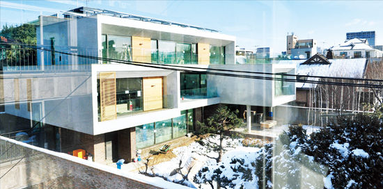 사저는 ‘기역(ㄱ)자’형 한 동이다. 인근 빌딩 꼭대기층에서 내려다 봤더니 건물 앞면에는 층마다 통창에 가까운 커다란 유리창을 달았고, 뒷면과 양 옆면 외벽은 시멘트로 마감 처리했다. 내부 모습은 보안상 문제로 청와대 경호처가 일절 공개하지 않고 있다.