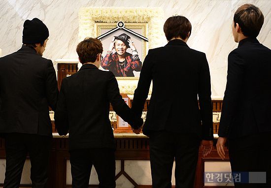 11일 오후 위암으로 사망한 그룹 울랄라세션의 리더 임윤택의 빈소가 서울 신촌 세브란스병원 장례식장에 마련됐다. 빈소를 찾은 울랄라세션 멤버들이 임윤택의 영정 앞에서 손을 잡고 있다.
