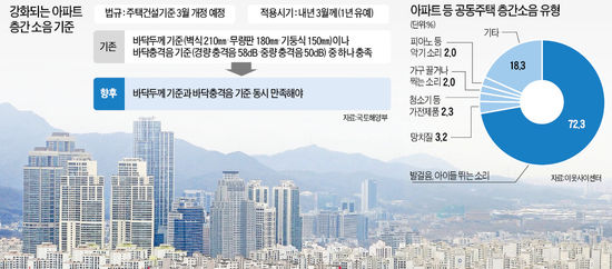 국토부는 12일 아파트 시공 때 바닥두께 기준과 바닥충격음 기준 둘 중 하나만 만족하도록 한 주택건설 기준 규정을 고쳐 ‘두께와 충격음’의 두 기준을 동시에 만족하도록 주택건설 기준을 개정하는 작업을 진행 중이라고 발표했다.