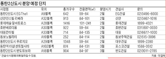 경기도 화성시 동탄2신도시 분양이 이달 말부터 시작된다. 롯데건설, 대우건설, 신안, 호반건설, 대원, 동보주택건설, EG건설 등 7개 건설사가 6207가구를 동시분양 방식으로 공급한다. 이달 말 모델하우스를 개장하고, 3월 초 청약을 받는다. 이어 다음달에는 포스코건설과 반도건설이 광역환승센터 인근 시범단지에서 각각 874가구와 904가구의 아파트를 공급할 예정이다.