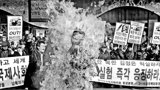 남침용땅굴찾는사람들, 납북자가족모임, 대한민국어버이연합, 탈북난민인권연합, 한미우호증진협의회 한국본부, D-15유격백마부대 전우회 등 시민단체 회원들이 13일 서울 광화문 KT 사옥 앞에서 북한의 핵실험을 규탄하는 집회를 열었다. 회원들이 성명서를 낭독한 뒤 김정은 인형을 불태우고 있다. 허문찬 기자 sweat@hankyung.com