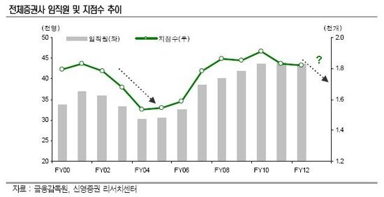 증권사 지점이 줄어들면서 인력도 감축됐다. 2011년 9월말 4만3820명에 달했던 증권사 임직원 수는 1년 후 4만3091명으로 729명 줄었다.