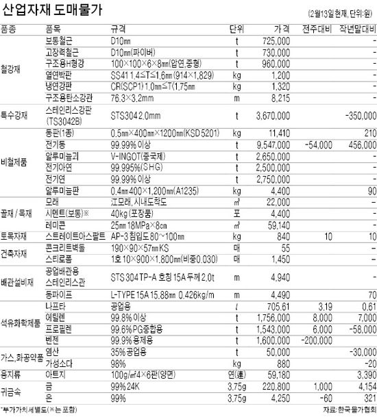비철제품 중 전기동(99.99% 이상 기준) 가격은 국제시세가 하락한 영향으로 전주보다 t당 5만4000원(0.6%) 내린 954만7000원에 거래됐다.