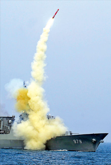 우리 군이 개발한 함대지 순항미사일(해성)이 구축함에서 발사돼 목표물을 타격(작은 사진)하고 있는 장면을 국방부가 14일 공개했다. 구축함과 1800t급 잠수함에 실전 배치된 이 미사일은 북한 전역을 타격할 수 있는 사거리 1000㎞ 수준이며 북한군 지휘부의 창문까지 공격할 수 있는 정밀도를 갖췄다. /국방부 제공