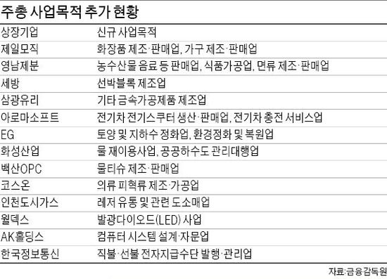 신규 사업을 추진하기 위해 주총에서 사업목적을 추가하려는 기업들도 잇따르고 있다. 제일모직은 내달 15일 주총에서 화장품 제조·판매업을 신규 사업목적으로 추가하기로 했다. 영남제분은 농수산물 및 음료, 식품가공업 판매업 등을 사업목적에 넣을 예정이다. 세방은 선박블록 제조업, 삼광유리는 금속가공제품 제조업을 각각 추가한다. 인천도시가스는 관광 레저 유통 관련사업을 사업목적에 넣기로 했다. EG는 토양 및 지하수 정화업, 환경정화 복원 사업을 새롭게 넣는다. 코스닥 기업들도 신규 수익원 발굴을 위한 준비에 나선다. 아로마소프트는 전기차 사업 등을, 월덱스는 발광다이오드(LED) 사업을 추가한다.