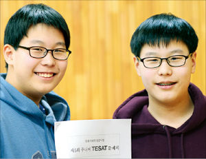 “경제와 수학의 공통점은 원리의 이해입니다. 경제·수학 원리의 터득은 다른 학과목 성적 향상에도 크게 도움이 됩니다. 저희가 1회부터 5회까지 치러진 주니어 테샛에 모두 응시한 이유이기도 합니다.”주니어 테샛을 치른 대원 국제중학교(2년) 윤호준(오른쪽)·호재 쌍둥이 형제의 당찬 대답이다. 이들 형제는 한마디로 ‘수학 귀재’다. 호준·호재군 모두 미국 존스홉킨스대에서 수학 과목으로 총장상을 받았고, 국내 전국 수학대회에서 1등상을 탈 정도로 수학에 탁월한 재능을 보이고 있다. 또 이들 형제는 1회 주니어 테샛부터 17일 치러진 5회까지 한 차례도 빼놓지 않고 응시했다. 이들은 4회 시험에서 개인 장려상과 동아리 최우수상을 수상했다.