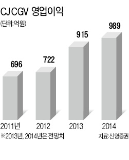 지난 13일 일부 상영관의 영화관람료를 인상한 것도 실적 개선에 기여할 것이란 분석이 나오고 있다. 이선애 IBK투자증권 연구위원은 “가격 인상 이후 주말이 한 차례 지났지만 관객 증가율이 둔화되지 않았다는 점에 주목할 필요가 있다”며 “올해는 휴일도 많고 매 분기 기대작들이 고루 대기하고 있어 관람료 상승이 결국 CJ CGV의 실적 개선으로 이어질 것”이라고 전망했다.