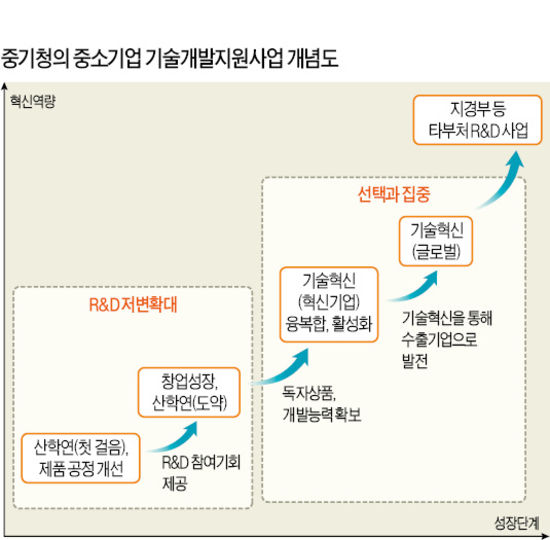 중기청의 지원체계도 달라지고 있다. 초기의 단순지원 방식이 아니라 요즘은 과제선정 전 기획단계부터 성과관리까지 전 단계를 체계적으로 관리해주고 있다. 특히 올해는 한국산업기술평가관리원과 함께 ‘2013 중소기업 통합기술로드맵’을 수립해 1005개 핵심기술을 선정하고 이 중 유망기술에 대한 선제적 투자를 위해 4395억원을 책정하는 등 기획·평가·관리에 있어서도 선진국에 버금가는 수준에 이르렀다는 평가를 받고 있다.