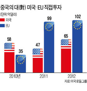 미국으로 가던 중국의 돈이 유럽으로 방향을 돌리고 있다. 유로존(유로화 사용 17개국) 재정위기로 투자 기회가 늘어난 데다 미국이 안보 문제를 내세워 중국의 투자를 규제하는 경우가 많기 때문으로 분석된다.26일 미국 컨설팅 회사인 로듐그룹에 따르면 유럽에 대한 중국의 해외 직접 투자는 지난해 102억달러로 전년에 비해 3% 증가했다. 이는 같은 기간 미국에 대한 직접 투자 65억달러보다 56.9%나 많은 것이다. 2010년 중국의 미국 직접 투자는 58억달러로 유럽연합(EU)에 대한 투자 35억달러에 비해 훨씬 많았지만 지난 2년 동안 상황이 바뀐 것이다.