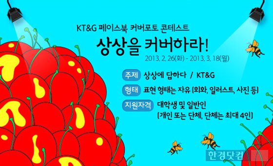 KT&G(사장 민영진)가 소셜커뮤니티인 페이스북(Facebook)용 커버 포토 콘테스트를 개최한다.커버포토란 메인화면을 꾸밀 수 있는 사진으로 공모분야는 KT&G 사회․문화 공헌활동을 소재로 한 'KT&G리그'와 소재 제한이 없는 'MY리그' 등 2개 부문으로 나뉜다.