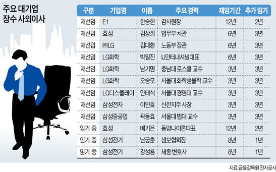 LG화학만 그런 게 아니다. 액화석유가스(LPG) 업체인 E1은 주총에서 사외이사인 한승헌 전 감사원장의 임기를 2년 늘리기로 했다. 임기를 채우면 한 전 원장은 14년간 사외이사를 하게 된다. (주)LG와 효성도 6년째 사외이사를 맡고 있는 김대환 전 노동부 장관과 김상희 전 법무부 차관의 임기를 각각 3년 더 연장한다.